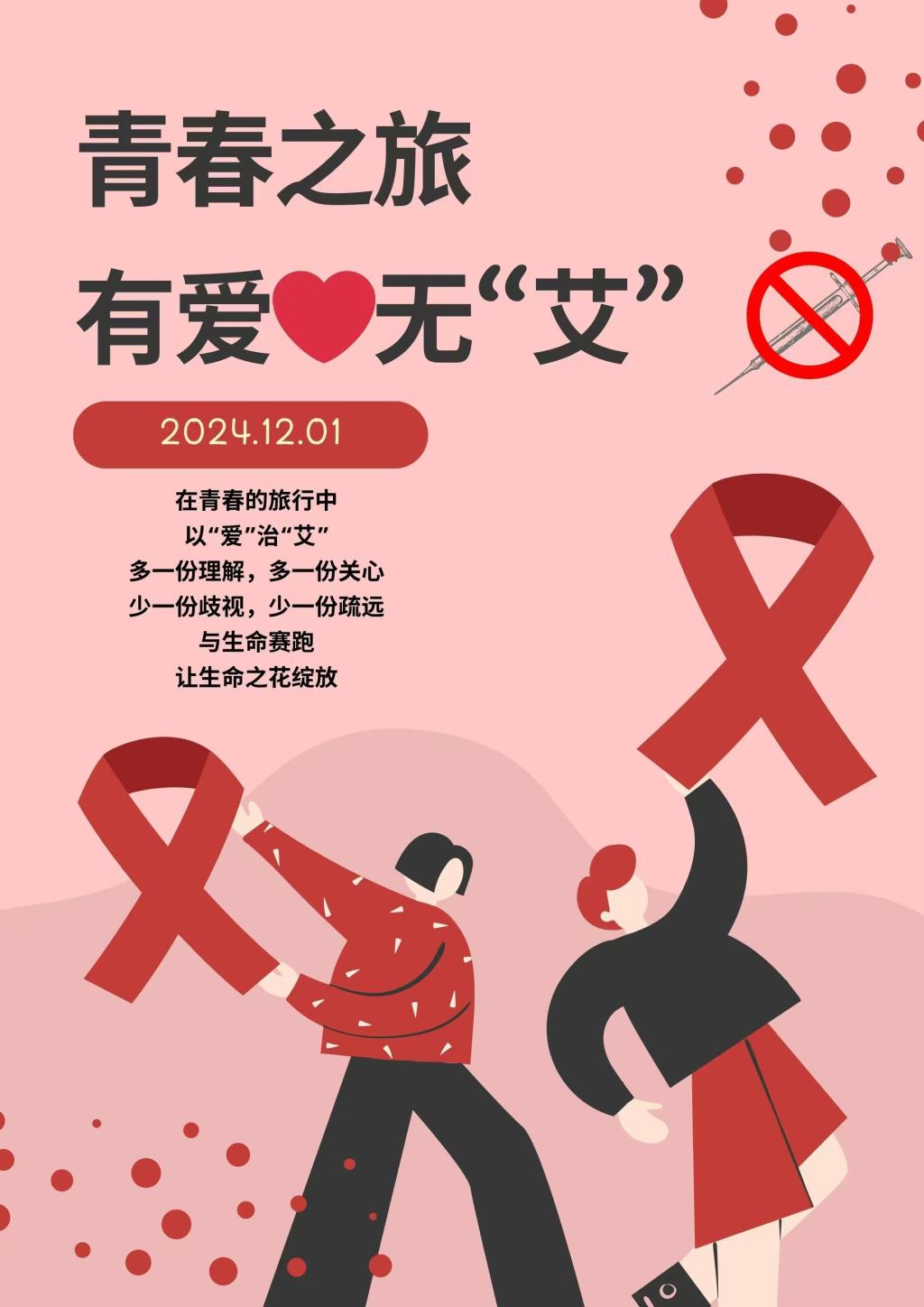 设计以粉色为主基调,象征对艾滋病患者需饱有温柔,希望能关心理解他们。图片里的男女富有活力,象征青春男女在当前年龄下热情澎湃。红丝带是对HIV患者的关心、支持和希望。禁止针头是需要注意不交叉使用注射器,不吸毒,减少通过血液传播。两位年轻人手持红色丝带,象征爱与希望,寓意青春旅程的美好。底部标语强调爱与理解的重要性,呼吁减少歧视与疏远,共同为生命之花绽放努力。设计理念:通过简洁明了的设计,传达爱与关怀的主题。色彩和谐,富有感染力,旨在引起观众共鸣,传递正能量。此海报设计旨在激发人们对青春与爱的思考,共同为构建一个更加包容与理解的社会而努力。