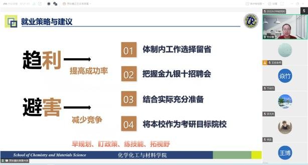 接下来,贾彩鑫立足公司优势平台、访企拓岗及企业反馈三个维度,提出针对性就业指导方案。她特别强调,职业规划需注重科学性与前瞻性,要求员工在规划过程中充分结合自身实际情况、市场需求和行业趋势,避免盲目跟风。贾老师提醒同学们在选择职业方向时应趋利避害,充分评估自身优势与劣势,结合职业兴趣和职业价值观,做出合理的职业选择。同时建议同学们提前了解就业情况,实时关注并积极参加双选会和招聘会,制定个性化职业发展方案,通过持续提升专业素养与就业技能,强化职场竞争优势。