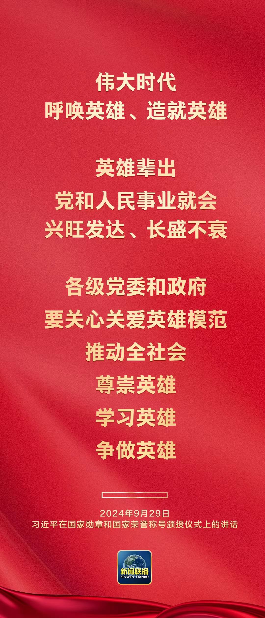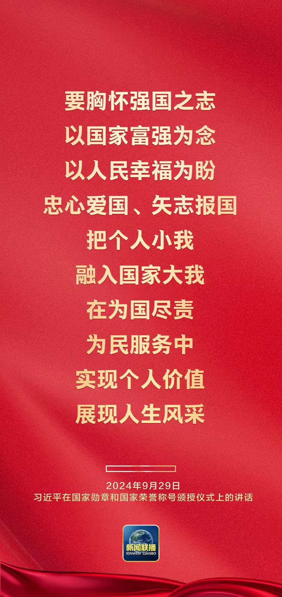 9月29日上午,中华人民共和国国家勋章和国家荣誉称号颁授仪式在人民大会堂隆重举行。中共中央总书记、国家主席、中央军委主席习近平在国家勋章和国家荣誉称号颁授仪式上发表重要讲话。