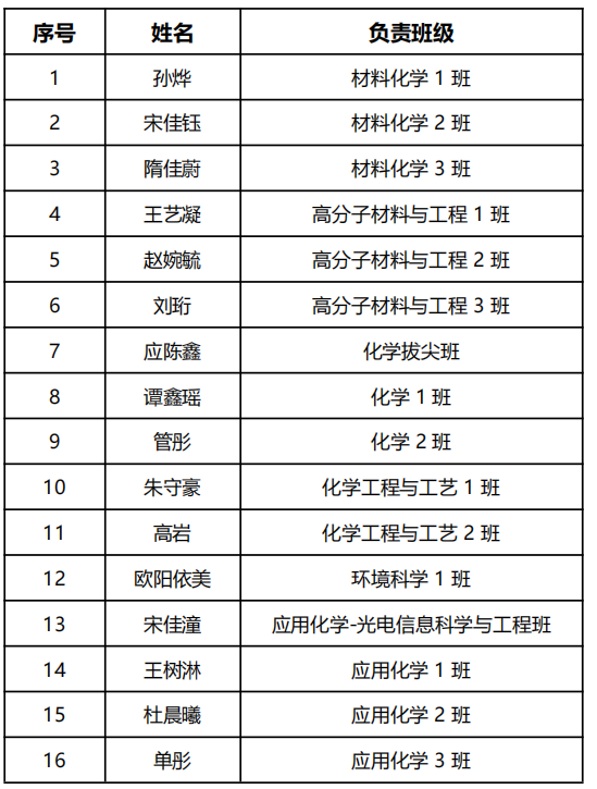 为加强公司员工管理工作,充分发挥员工自我管理、自我教育和自我服务的作用 ,提升员工的组织管理能力,并为做好迎接 2024 级新生准备工作,化学化工与材料公司开展 2024 级新生班主任选拔活动,此次选拔本着公平,公正,公开的原则,选举xc体育 2024 级新生班主任。经过公司老师的综合员工学习成绩、工作能力、生活状况等方面考量 ,现将公示名单公布如下: