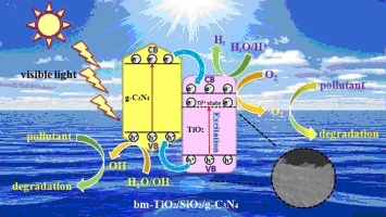 TiO2因其环境友好性,无毒性,价格低廉等优点应用前景广阔。但目前单一的光催化剂面临两个致命的缺点:低量子效率和高光生电子-空穴复合率。因此,寻求其它高性能材料与TiO2复合形成异质结构是克服TiO2缺点的有效办法。选择二维片状g-C3N4作为共催化剂不仅能够高效分离光生电子-空穴,同时增强光催化剂的产氢性能。体系中引入SiO2可以有效增大光催化剂的比表面积从而增加光催化剂表面的活性位点。此外,为进一步拓宽催化剂对可见光的吸收范围,利用表面还原的方法制备出Ti3+自掺杂黑色介孔TiO2/SiO2/g-C3N4。该复合光催化剂比表面积为~145.6m2 g-1,孔尺寸为~4 nm。使用这种高效光催化剂,苯酚降解率和Cr6+的还原率分别达到98.5%和97%。同时,黑色介孔TiO2/SiO2/g-C3N4的产氢率高达572.6 μmol h-1 g-1。课题组所制备的可见光复合光催化剂将推动其在环境和能源领域的实际应用。