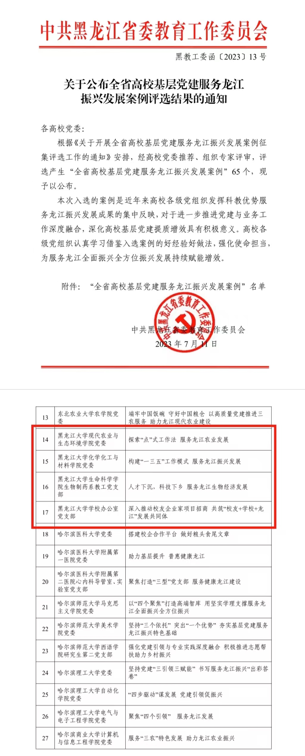 近日,省委教育工委正式发布《关于公布全省高校基层党建服务龙江振兴发展案例评选结果的通知》(黑教工委函〔2023〕13号)。根据《关于开展全省高校基层党建服务龙江振兴发展案例征集评选工作的通知》安排,经高公司党委推荐、组织专家评审,评选产生“全省高校基层党建服务龙江振兴发展案例”65 个。