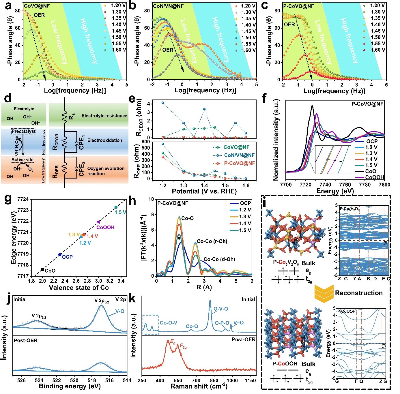 如图4所示,在1.20 ~ 1.45 V的低电压范围内,P-CoVO@NF的ROER值急剧下降,但仍然很大,说明催化剂只发生了快速的结构变化。当电压超过1.45 V时,P-CoVO@NF的ROER值趋近于零,表明OER开始发生,而CoN/VN@N在1.5 V以上才开始。这表明P−O的调节提高了*OH的利用率,使P-CoVO@NF具有更好的电荷转移和去质子化能力。原位同步辐射表明Co的氧化态从OCP下的+2.31逐渐上升到1.20 V下的+2.69,再到1.30 V下的+2.71和1.40 V下的+2.76,最终在1.5 V时上升到+3.31。在OCP处,1.5 Å处的峰值与Co−O键的单散射路径有关,畸变八面体配位结构的Co−Co位于2.8 Å。当电位增加到1.2 V时,在2.4 Å处出现一个新的峰,这是由正八面体配位结构形成的。这导致高自旋Co2+向低自旋Co3+转变,带隙从0.615 eV减小到0 eV,从而获得高电导率和良好的OER活性。V的溶解在晶格中产生空位,不仅为促进这种构型转变提供了足够的空间,而且提高了电解质中的OH–离子与钴位点接触形成CoOOH的机率。拉曼测试表明,经过循环伏安测试后,Co3V2O8的特征峰消失。同时,在468和548 cm-1处出现了新的峰,分别对应于CoOOH的Eg和F2g振动模式。