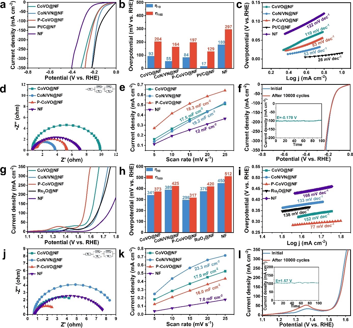 如图3所示,CoN/VN@NF和P-CoVO@NF在碱性条件下分别具有优异的HER和OER活性及稳定性。对于HER,CoN/VN@NF在电流密度为100 mA cm-2时的过电位为164 mV。在连续10000次循环伏安测试后仍保持其初始活性,没有明显衰减。对于OER,P-CoVO@NF只需要317 mV的过电位就能提供100 mA cm-2的电流密度,且在100小时后,没有观察到明显的活性衰减。