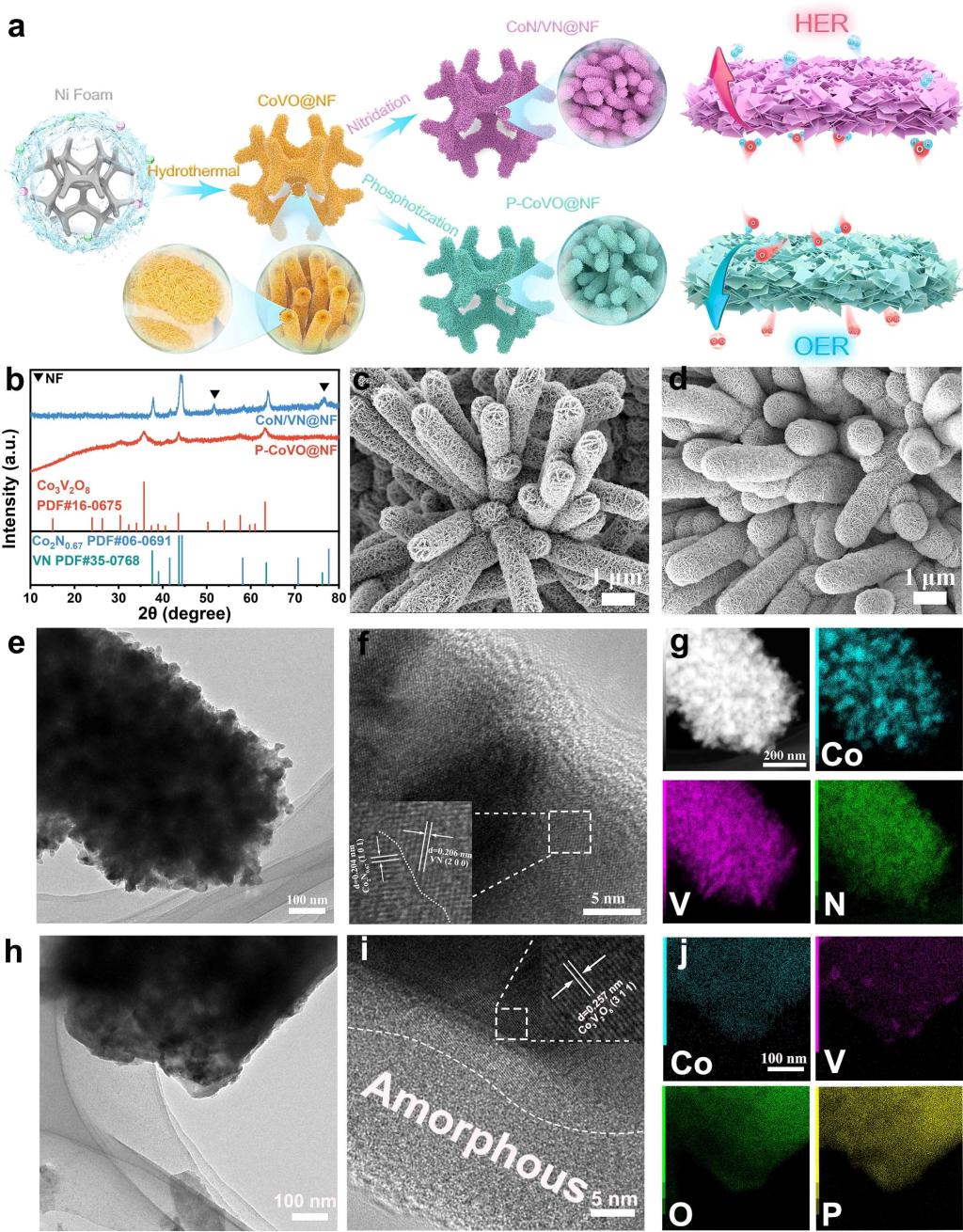如图1所示,首先利用钴物种的层状生长和钒物种的一维导向作用,采用液相自组装的方法合成了具有珊瑚状纳米阵列的前驱体。然后分别进行氮化和磷酸化处理得到CoN/VN@NF和P-CoVO@NF。珊瑚状纳米阵列结构在煅烧中得到了保留,这种特殊的形貌不仅具有丰富的活性位点能够提高催化活性,并且为催化反应过程中体积和应力波动提供了足够的空间,从而提高了稳定性。