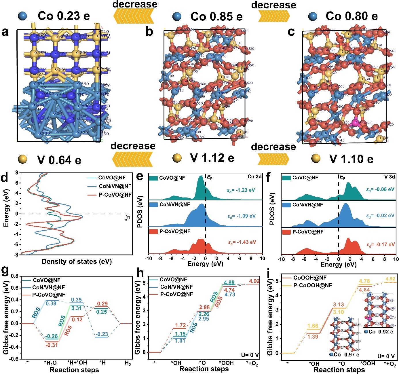 如图5所示,氮和磷酸阴离子的调控都提高了Co和V原子周围的电子密度。与P−O基团相比,氮阴离子可以与金属产生更强的电子耦合作用,从而导致更低的电荷分布。对于HER而言,氮化可以使V的d带中心上移,增强*OH在V位点上的吸附,从而加速水解离过程,提高HER活性。而对于OER而言,磷酸化会导致Co的d带中心向下移动,这有利于OER过程中含氧中间体的去质子化,平均能量势垒,从而增强反应动力学。
