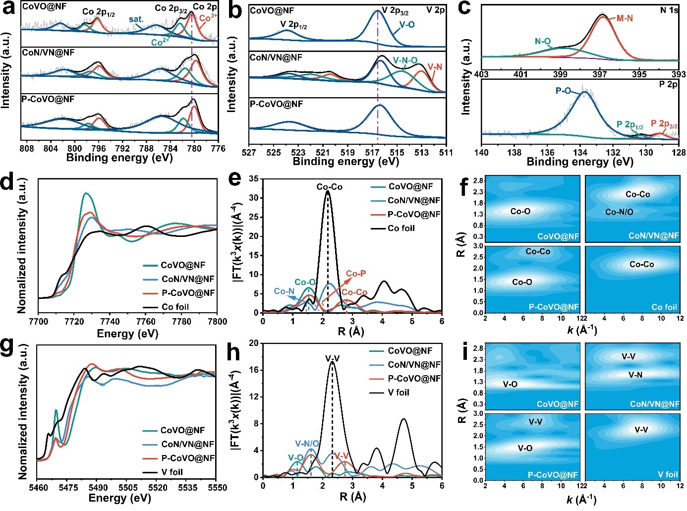 如图2所示,氮化和磷化后,Co和V的价态出现了不同程度的负移。N 1s光谱和P 2p光谱显示,N和P主要以M-N和P-O键的形式存在。CoN/VN@NF在钴的FT-EXAFS光谱中1.46和2.20 Å处的优势峰分别属于Co−N/O键和Co−Co键。与CoV@NF相比,P-CoVO@NF的Co−O键强度在1.52 Å附近降低,表明平均配位数降低,氧空位的形成,这可以增强电子传递能力。CoN/VN@NF在钒的FT-EXAFS光谱中表现出以下的四个主要特征峰。1.63和2.42 Å处的峰对应于由6个对称的V−N和V−V键组成的内壳层,而3.70和4.45 Å附近的峰属于更高的V−N和V−V壳层。对于P-CoVO@NF,最强的V−O键位于1.62 Å而不是CoVO@NF的1.12 Å,这是由于P的掺入导致了Co3V2O8晶格内V−O键的拉伸。这种局部的结构变化使得V−O键容易断裂,导致V在OER过程中溶解,从而促进钴的重构。