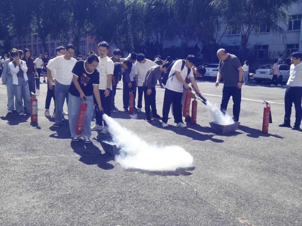 大会结束后,全体2024级研究生来到知新楼门前进行了消防演习。安全保障部干警们细心指导员工进行灭火器实际操作演练,使员工熟练掌握了灭火器的正确使用方法,进一步明确了消防安全的重要性,强化了同学们的消防意识。