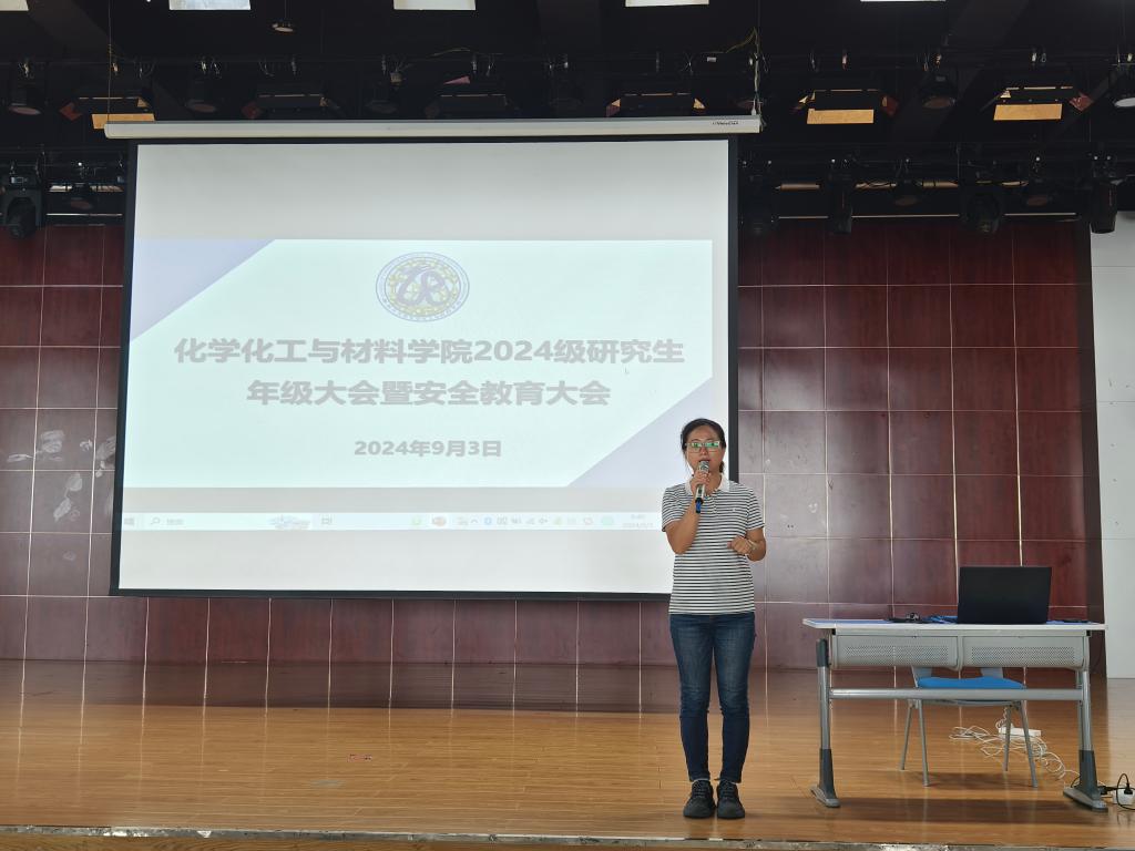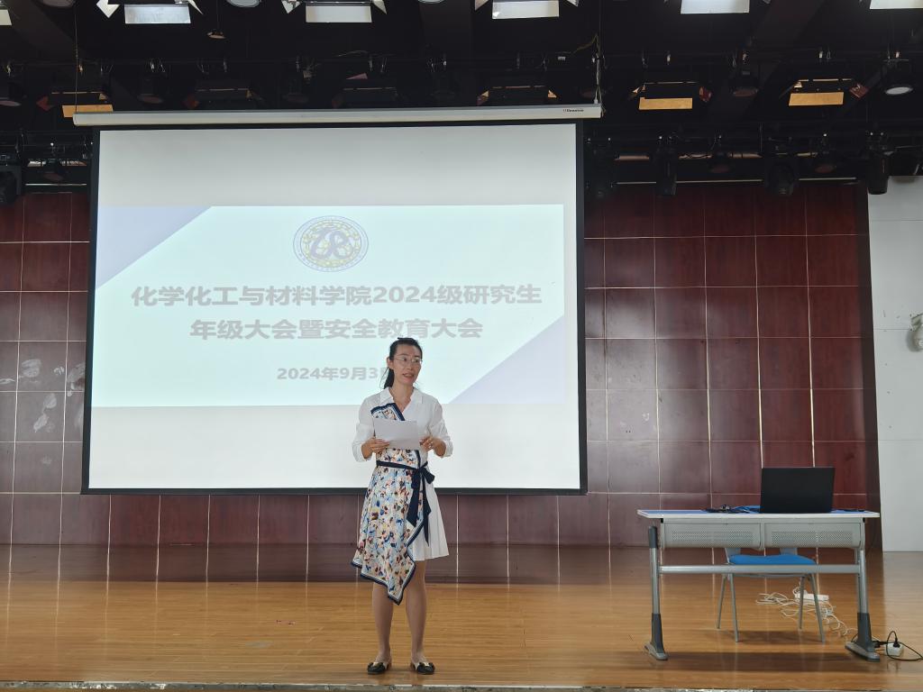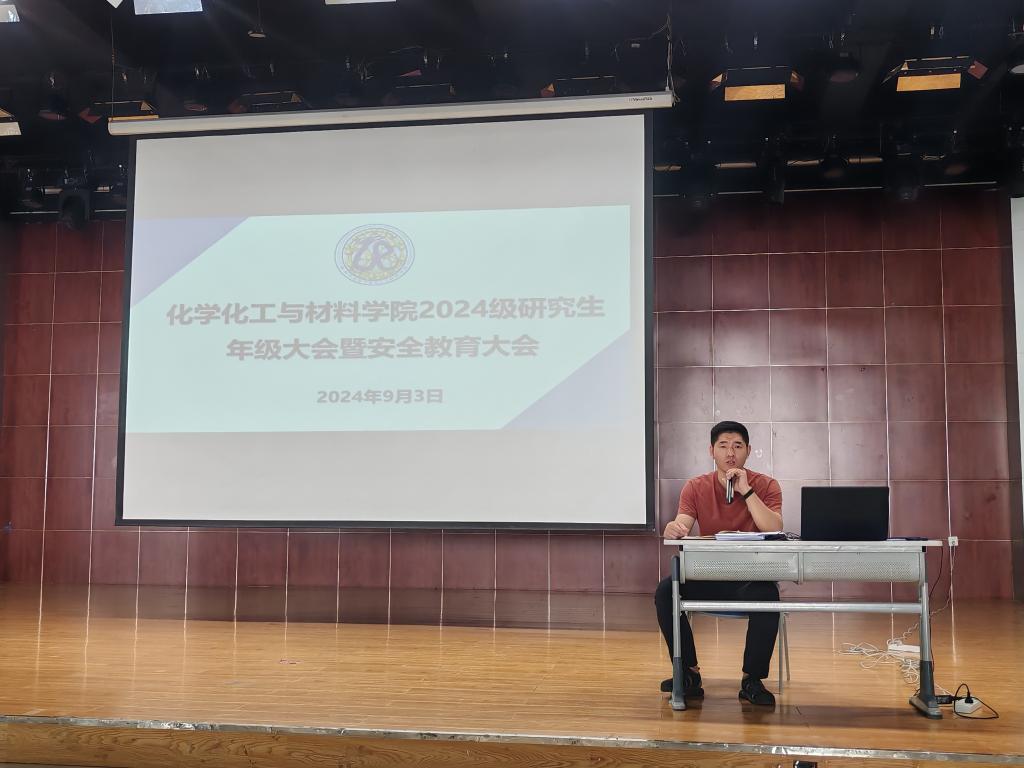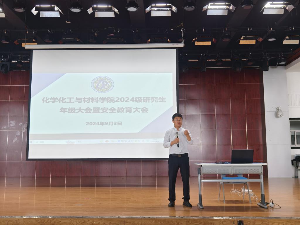 大会第一项,副经理徐英明老师代表公司向2024级研究生表示衷心的祝贺和热烈的欢迎,并介绍了公司的建院历史、重点学科设置及优秀的团队队伍,他强调公司已形成涵盖旗下产业、硕士研究生教育、博士研究生教育、博士后工作站的完整教育体系,是全省理科化学科学研究和教学人才的摇篮。然后,徐英明老师向新生同学们提出了四点期望,一是要明确所在专业的毕业要求,为即将到来的研究生学习生活做好规划,二是要明确导师要求,与导师多交流,多沟通,三是需要明确自己的发展方向,做好职业规划,四是注意安全,遵守实验室管理规定。