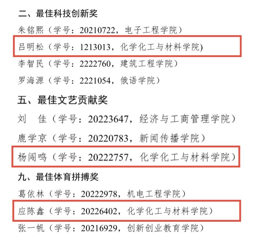 为进一步推进校园文化建设,激励广大青年学子向身边榜样学习,传承并弘扬“五四精神”,坚定理想信念,筑牢中国特色社会主义根基。xcsports举办第二十九届“校园最佳”老员工评选活动。遵循公平、公正、公开的原则,经员工本人提交申请,公司进行初评,公司评审委员会进行答辩及综合评定,最终公司2021级无机化学专业博士研究生吕明松荣获“最佳科技创新奖”荣誉称号、2022级化学专业杨闯鸣荣获“最佳文艺贡献奖”荣誉称号、2022级化学专业应陈鑫荣获“最佳体育拼搏奖”荣誉称号。