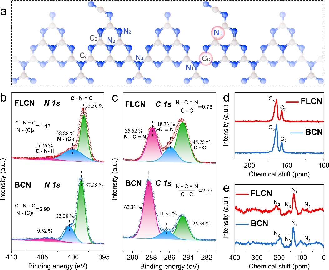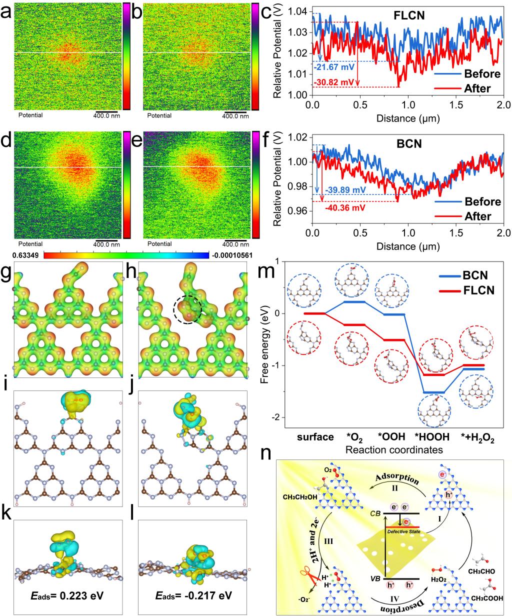 通过有机阳离子剥离块体PHI,研究团队成功制备出超薄PHI纳米片(FLCN)。透射电子显微镜和原子力显微镜显示,FLCN呈现均匀的纳米片结构,厚度仅约6.6 nm。正电子湮没谱、X射线光电子能谱、电子顺磁共振和DFT理论计算等分析表明,剥离过程诱导了PHI基面的碳氮缺陷,形成分子重构活性位点。这种缺陷结构促进了电荷分离与电子局域化,同时产生中带隙态,为一步双电子氧还原路径提供了关键反应位点(图1,图2)。