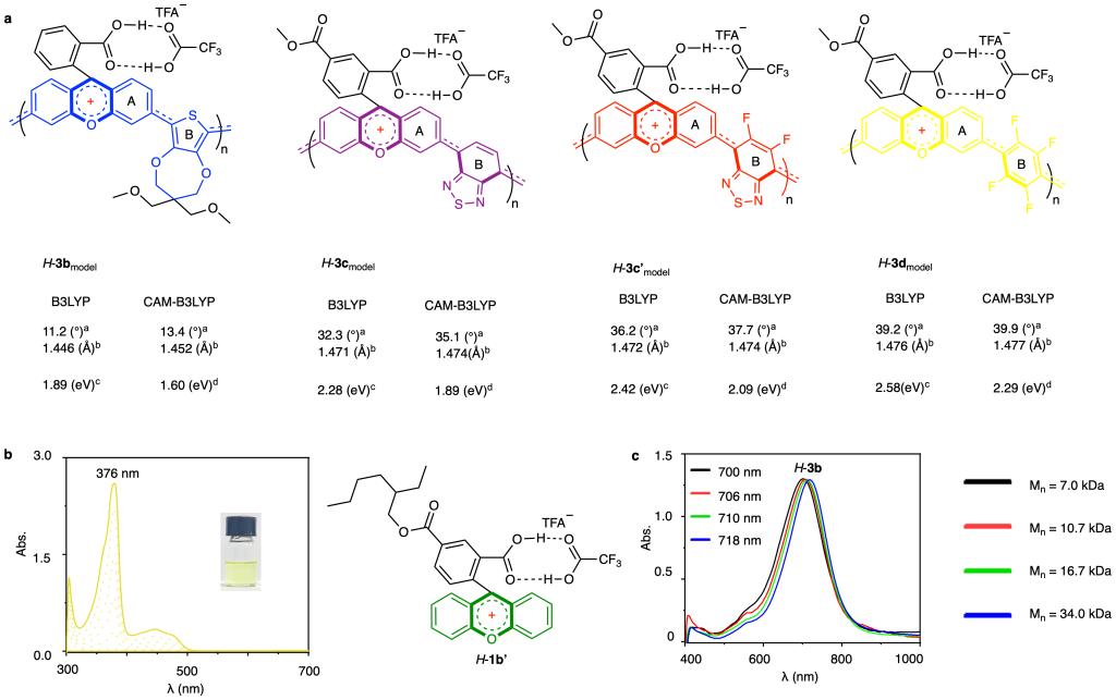 图 3. 基于DFT建模与实验研究的机理解析。(A) 采用DFT计算优化的聚合物模型H-3b至H-3d的分子结构。a环A与环B之间的平均二面角;b环A与环B之间的平均键长;c基于B3LYP/6-31G(d,p)方法计算的带隙;d依据溶液吸收起始波长估算的带隙。(B) 小分子模型1b’在TFA处理后的紫外–可见吸收光谱。(C) 分子量对光电性能的影响,通过聚合物3b薄膜在电刺激下的紫外–可见吸收光谱体现。