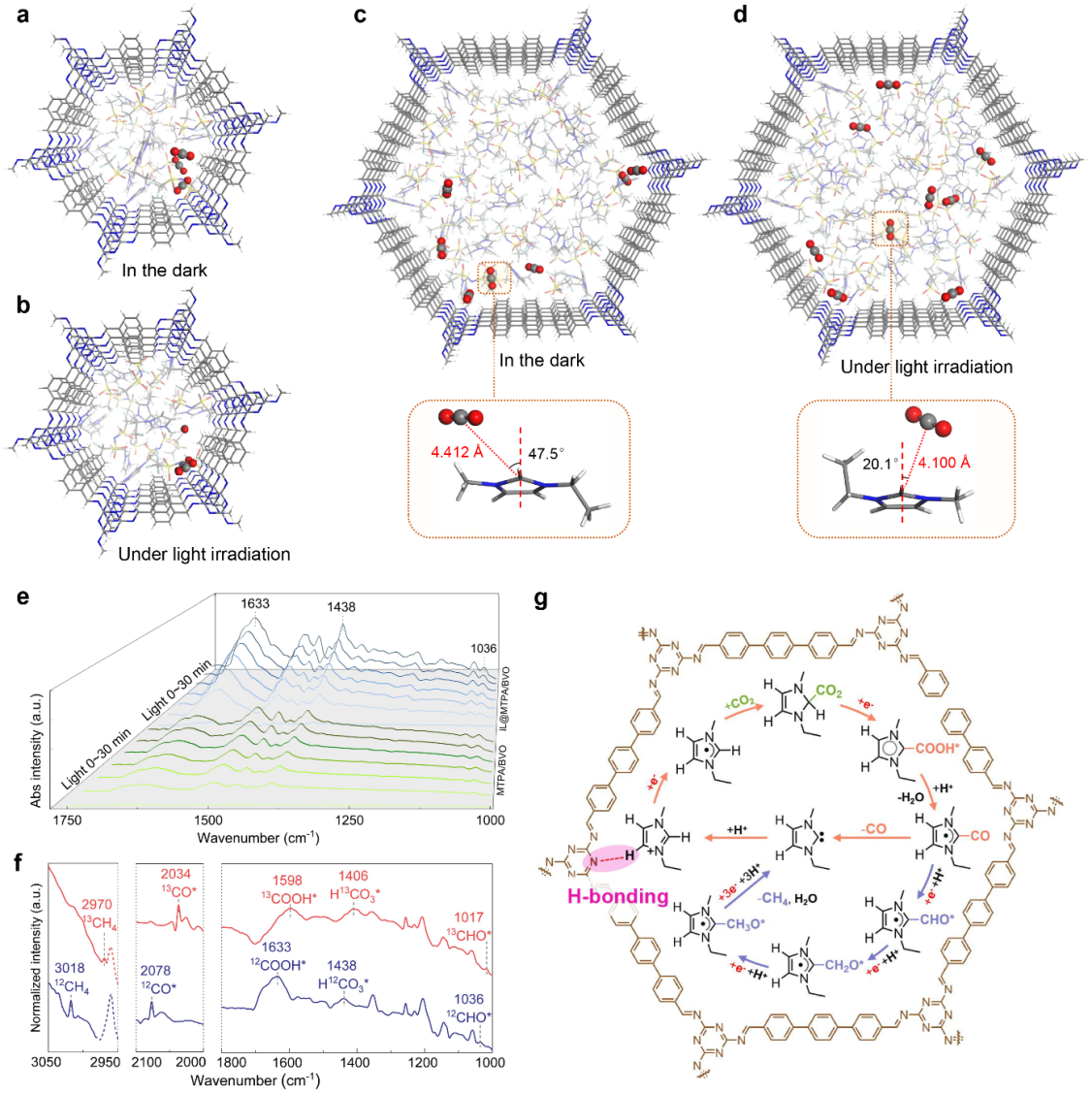 图6 (a) 暗态及 (b) 光照条件下CO2 + IL@MPA体系的分子动力学模型;(c) 暗态及 (d) 光照条件下CO2 + IL@MTPA体系的分子动力学模型(插图为[EMIM]+与CO2相互作用的放大示意图,穿过C2原子的红色虚线垂直于[EMIM]+平面);(e) MTPA/BVO(绿色)和IL@MTPA/BVO(蓝色)催化CO2光转化30分钟的原位FTIR光谱;(f) IL@MTPA/BVO催化12CO2(蓝色)与13CO2(红色)光还原的原位FTIR光谱对比;(g) 纳米反应器内以[EMIM]+为催化位点的CO2转化机理示意图。