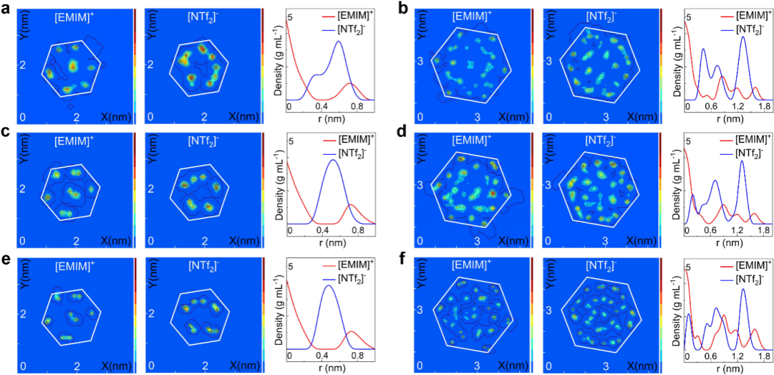 图5 孔内离子密度与取向分布:(a) 暗态下IL@MPA及 (b) IL@MTPA体系;(c) 暗态下CO2 + IL@MPA及 (d) CO2 + IL@MTPA体系;(e) 模拟光照下CO2 + IL@MPA及 (f) CO2 + IL@MTPA体系。