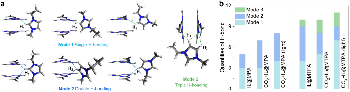 基于IL与三嗪COF界面氢键作用强度对于光生电子转移的重要作用,进一步分析上述三种条件下的界面氢键情况。根据具体氢键结合方式,归纳分类了三种典型的氢键模式:模式1单氢键(单层COF三嗪环N原子与[EMIM]+的单个H原子形成单氢键)、模式2双氢键(双层COF三嗪环N原子与[EMIM]+的单个H原子形成双氢键)以及模式3三氢键(双层COF三嗪环N原子与[EMIM]+的两个H原子形成三氢键)。其中,三种模式的氢键对界面电子转移的强化作用强度如下:模式1<模式2<模式3。对于微孔IL@MPA体系,暗态下,单氢键和双氢键数量分别为3和2;当加入CO2时,单氢键维持不变(3),双氢键增加(4);光照下,单氢键增加(4),双氢键维持不变(4)。然而,对于介孔IL@MTPA体系,新出现的三氢键模式可形成更强电子转移通路;暗态下,单、双及三氢键数量分别为4、5、1;当加入CO2时,单氢键增加(5)、双氢键减少(3),但三氢键增加(2);光照下,保持三氢键(2)的同时,整体氢键总和增加至11。CO2引入与光照协同强化界面氢键,促进纳米反应器内部的定向电子转移(与TPV结果一致)。