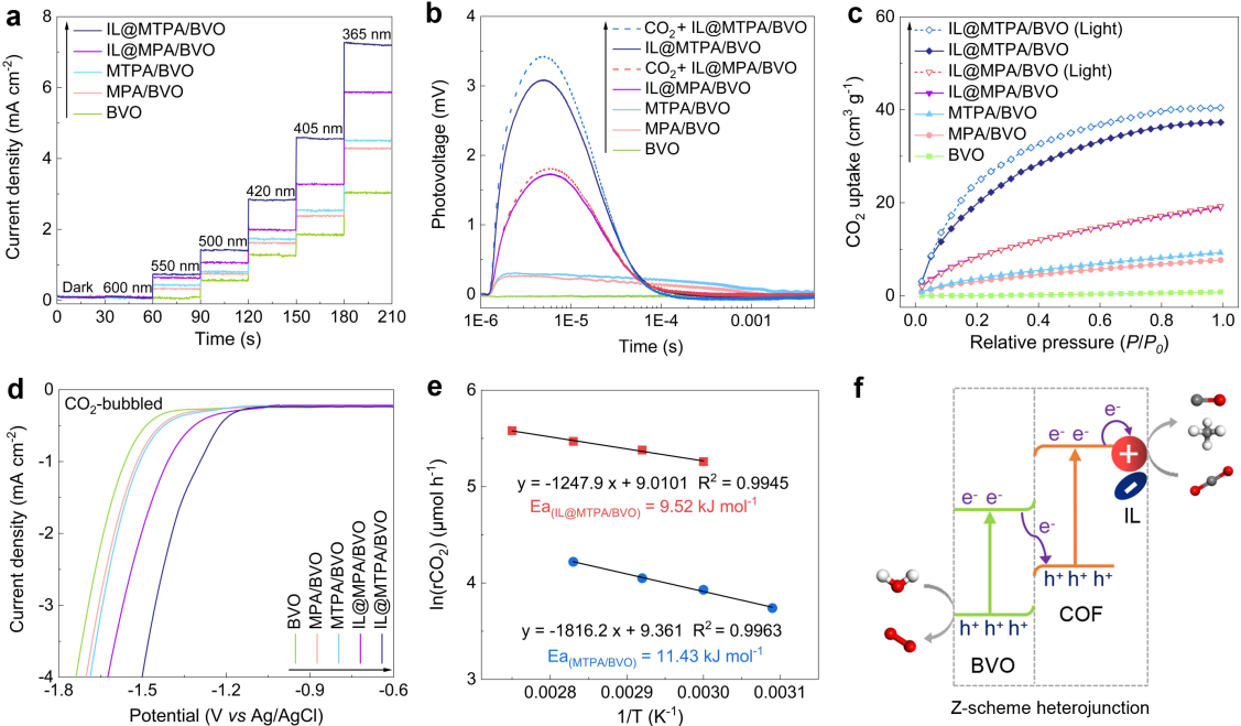 图4 (a) 单波长激发的光电流谱;(b) 准原位TPV光谱(实线:N2气氛,虚线:CO2气氛);(c) 273 K下的CO2吸附等温线;(d) BVO、MPA/BVO、MTPA/BVO、IL@MPA/BVO和IL@MTPA/BVO在CO2鼓泡体系中的电化学还原曲线;(e) MTPA/BVO和IL@MTPA/BVO的CO2光转化动力学;(f) IL@COF/BVO催化CO2转化的Z型光催化机理示意图。