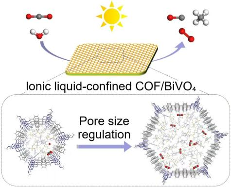 近日,xc体育井立强教授、白林鹭教授团队与清华大学唐军旺教授、吉林大学白福全教授开展跨校合作研究,创新性地提出了基于共价有机框架(COF)纳米孔限域作用发展光催化纳米反应器的研究思路,并探究了纳米限域作用对光催化过程机制影响。首先采用原位生长法在钒酸铋(BiVO4)纳米片表面生长二维三嗪COF获得Z型异质结,进一步将离子液体(IL)限域于三嗪COF纳米孔成功构筑了IL@COF光催化纳米反应器并实现了高效、高选择性的CO2还原过程。研究表明,Z型异质结良好的电荷分离有效提高了COF孔中的电子密度。相比于微孔,COF介孔的纳米限域作用强化了光催化过程COF与IL间的界面定向电子转移;光照诱导纳米限域IL微结构发生结构重排,显著促进了光催化反应过程中捕获CO2与催化CO2还原的能力。为发展基于COF材料的太阳能催化转化技术提供了新思路。