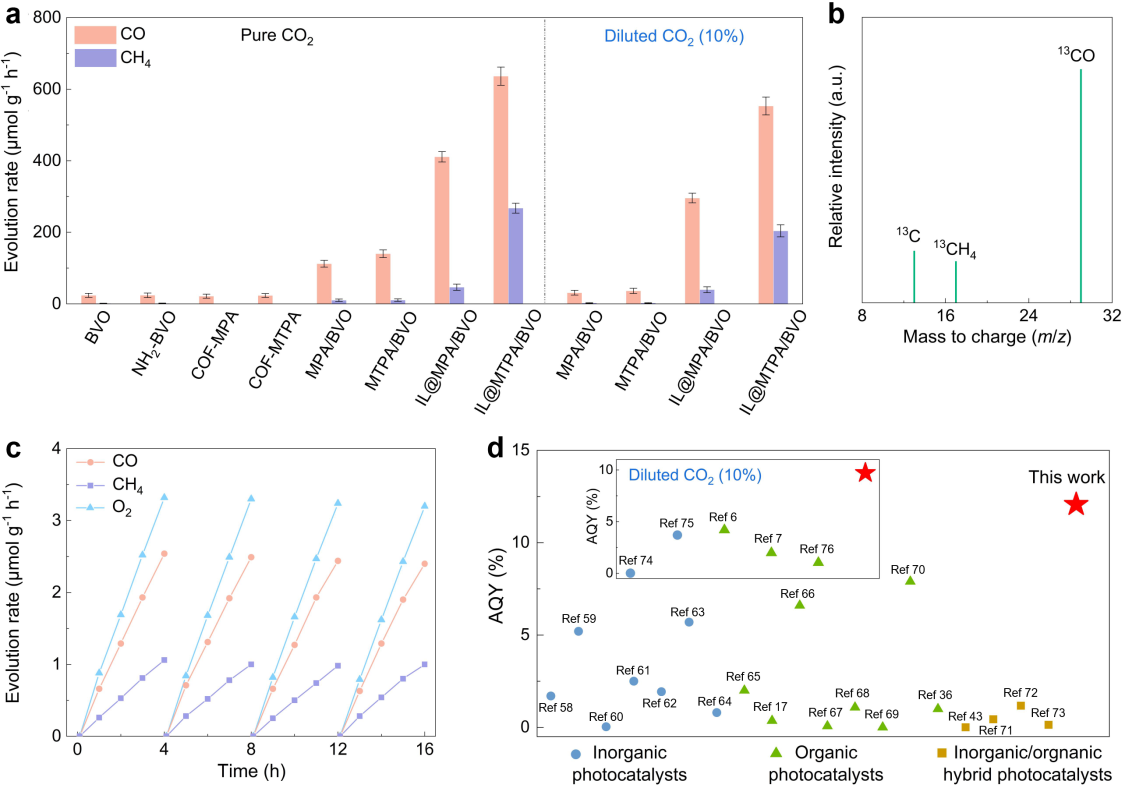 图3 (a) 标准样品在纯水中紫外-可见光照射下的CO2转化光催化性能。左图:进气为纯净的CO2气体;右图:进气为稀释10%的CO2(体积比10% CO2 + 90% N2);(b) IL@MTPA/BVO光催化13CO2转化产物的质谱分析;(c) IL@MTPA/BVO催化CO2光转化的四次连续循环测试;(d) 本工作与同类研究在相似反应条件下的表观量子产率(AQY)对比,插图为低CO2浓度下的AQY数据。