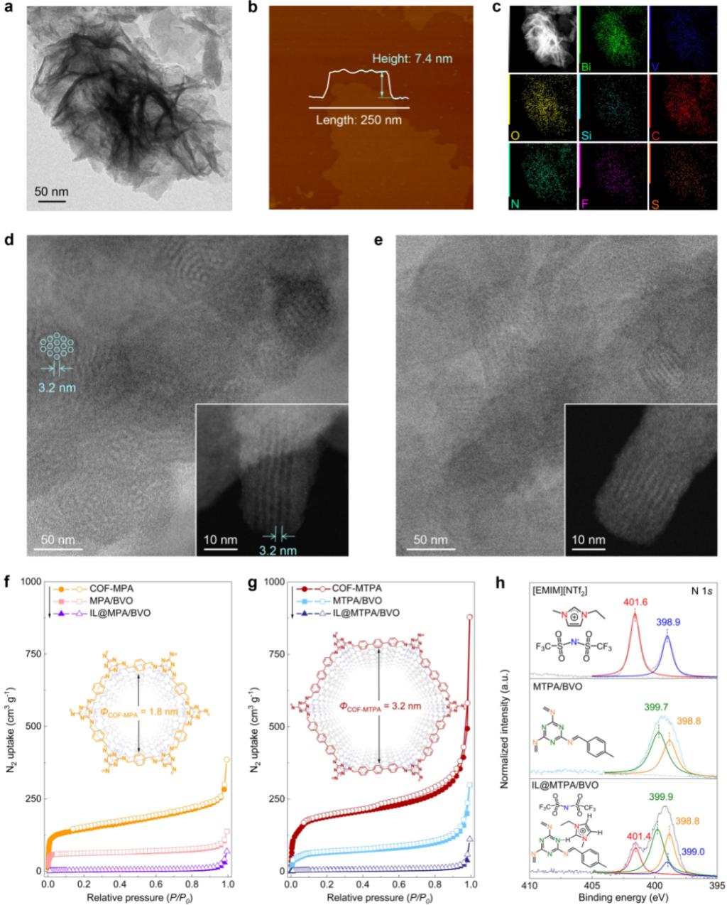 图2 IL@MTPA/BVO的 (a) TEM图像,(b) AFM图像及对应高度图和 (c) EDX元素分布图;(d) COF-MTPA纳米片和 (e) IL@MTPA的STEM明场图像(插图为暗场图像);(f) COF-MPA、MPA/BVO和IL@MPA/BVO以及 (g) COF-MTPA、MTPA/BVO和IL@MTPA/BVO在77K下的N2吸附-脱附等温线;(h) 块状[EMIM][NTf2]、MTPA/BVO 和IL@MTPA/BVO的N 1s轨道XPS能谱对比。