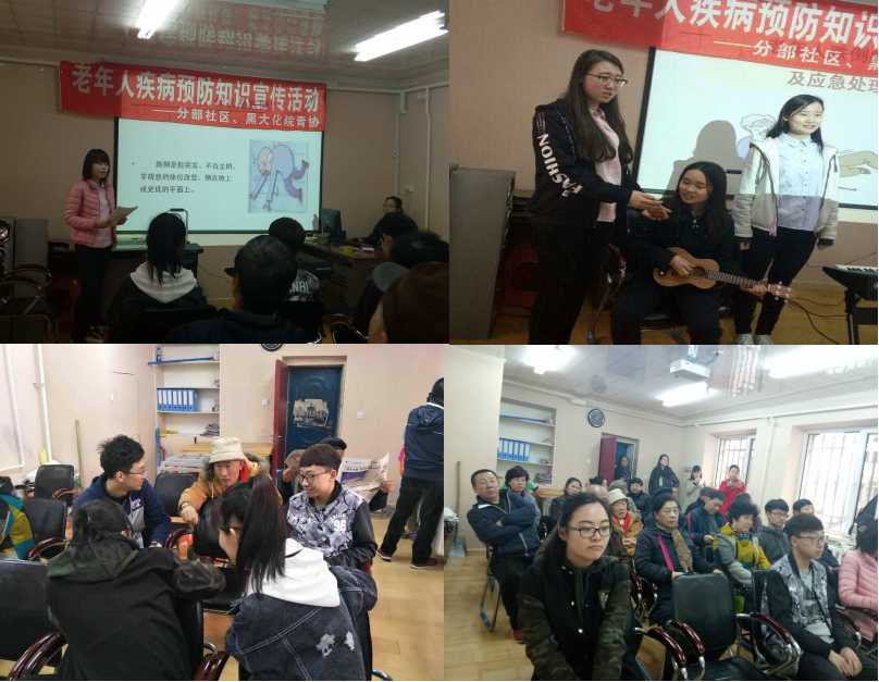 本次活动共有三组宣讲,都采用了PPT的形式,更加直观清楚地抒发己见。第一组宣讲人开场不凡,宣讲主题是老年人疾病的预防、发现和处理。首先介绍了老年人常见病的种类,例如慢性支气管炎,糖尿病,高血压病等等。介绍完每种疾病的症状后,对应给出了健康食谱并倡导合理安排运动时间,坚持做一些放松身心的舒缓运动。讲解的过程中,几位老人小声议论起自己的病症,对同学们的讲解表示满意。第二组宣讲人的宣讲主题是关于脑血栓的浅谈。脑血栓的前兆如哈欠不断,血压异常,数次出鼻血,突然眩晕等,这些方面一旦异常便一定要提高警惕。若确诊以后,服用药物的同时可以吃一些有益于健康的食物如山楂、洋葱、香菇、海带等,这些对降低血脂有很明显的积极作用。在第三组宣讲之前,为了活跃现场的气氛,增强老人们的热情,由志愿者们为在场的老人们弹唱了一首经典歌曲——让我们荡起双桨,在欢快的歌声中,在座的老人热情地鼓着节拍并跟着一起唱起来,气氛温暖了大家的心。