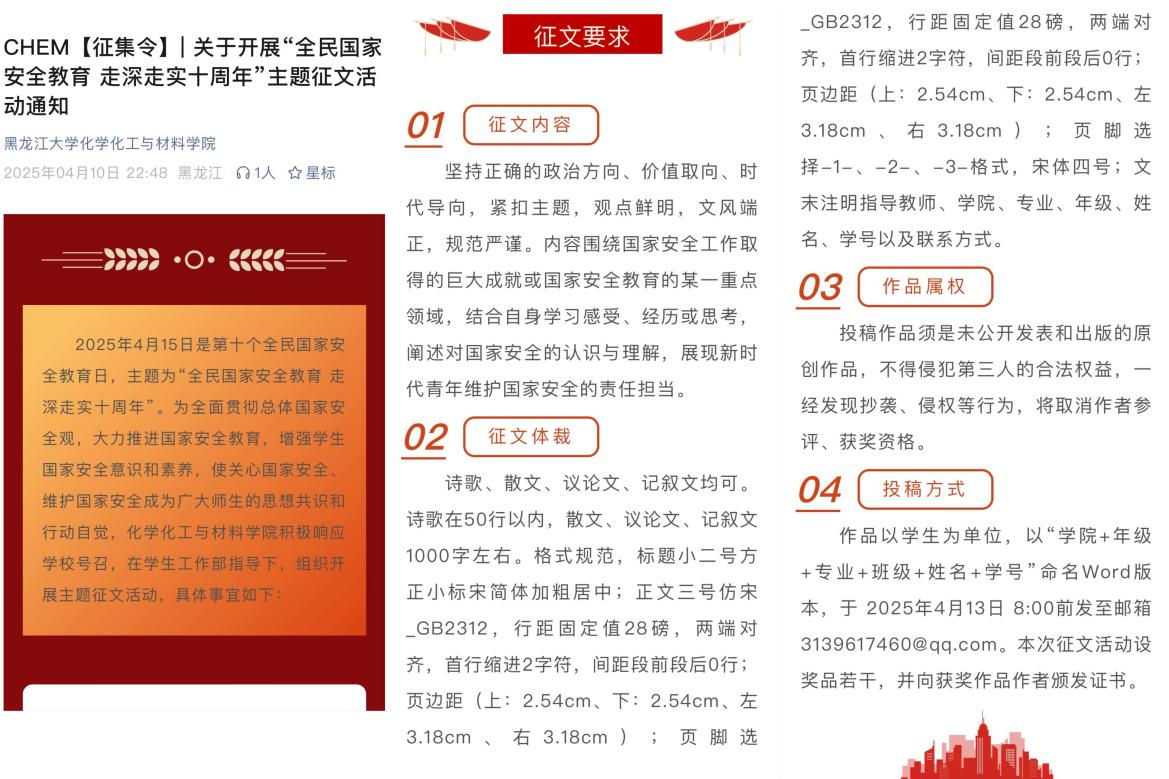 为深入贯彻落实总体国家安全观,进一步筑牢青年学子维护国家安全的思想根基。xc体育以第十个全民国家安全教育日为契机,积极响应公司号召,紧扣“全民国家安全教育,走深走实十周年”主题,立足学科特色与育人职能,多样化开展国家安全教育工作,扎实推动国家安全教育宣传工作提质增效。