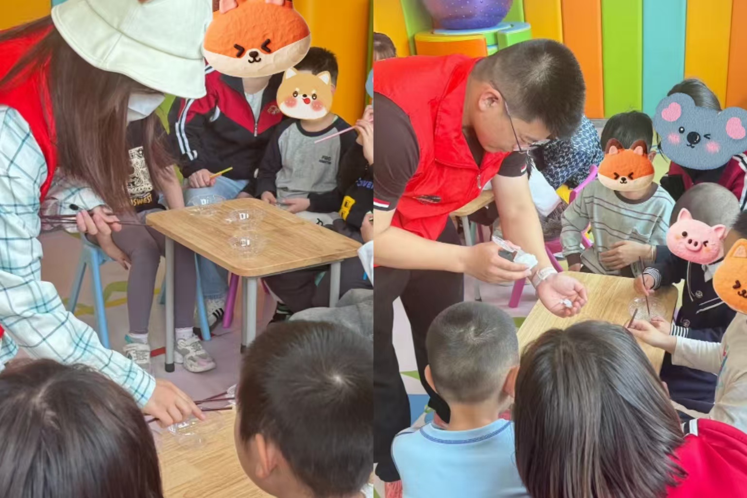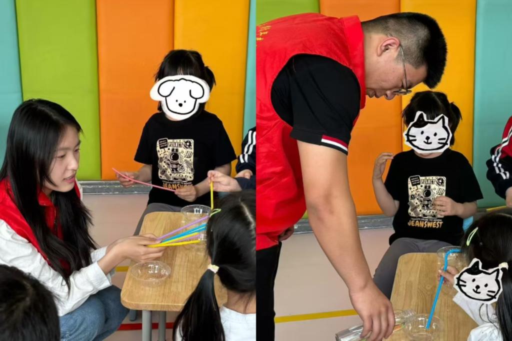 在“自制泡泡水”实验中,志愿者们为孩子们分发吸管和材料。然后在容器中倒入适量清水,加入洗洁精、白糖和少量甘油,用吸管轻轻搅拌均匀。志愿者先示范用吸管蘸取泡泡水,吹出一个大泡泡,接着让孩子们尝试吹出泡泡。孩子们争相蘸取泡泡水,鼓起腮帮时,有的皱紧鼻子吹出一连串小泡泡,有的轻轻一吹便诞生一个摇摇晃晃的“水晶球”,欢笑声在教室里此起彼伏。