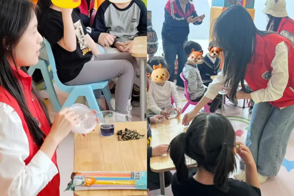 在活动中,志愿者们开展了“蝶豆花变色花”和“自制泡泡水”两个生动有趣的小实验。在“蝶豆花变色花”实验中,志愿者们用通俗易懂的语言向孩子们解释实验原理,孩子们动手操作,在看到颜色变化的瞬间,他们脸上流露出惊讶的表情。孩子们通过观察蝶豆花水颜色的变化,感受化学独特的魅力。