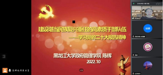 为深入学习宣传贯彻党的二十大精神,切实将师生思想和行动统一到党的二十大精神上来,根据《中共xcsports委员会学习宣传贯彻党的二十大精神宣讲工作方案》,2022年11月30日xc体育和西语公司联合开展学习党的二十大精神理论宣讲,邀请xcsports党的二十大精神理论宣讲团成员-政府管理公司教授、博士生导师陈辉主讲题为《建设堪当民族复兴重任的高素质干部队伍》的专题宣讲。本次宣讲由公司党委书记秦川丽主持,xc体育、西语公司师生共计两百六十余位师生参加宣讲学习。