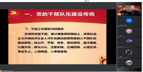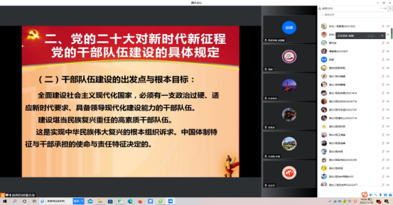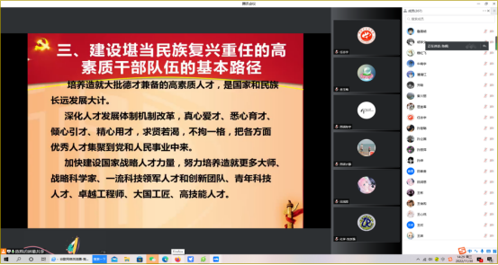 最后秦川丽书记做总结发言。她指出:通过宣讲学习,使师生深刻领会建设堪当民族复兴重任的高素质干部队伍的深刻内涵;习近平总书记对新形势下全体党员干部提出的更高标准和要求,针对当前任务,我们干部队伍要跟上时代步伐,跟上事业发展要求,提升理论修养,严格作风管理,强化责任担当,加强业务锻炼,提升综合素质,激发创新活力,为国家未来事业的长远发展筑牢人才基础、贡献积极力量。
