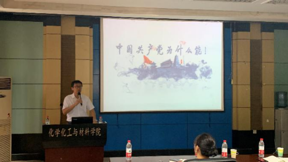紧接着,吴老师讲到“中国共产党为什么能”。他共提出以下五点:一是科学的理论指导,因为中国共产党始终高举马克思主义旗帜,始终坚持建党、强党,不断开辟理论发展新境界。二是坚定的理想信念,向大家举出不同发展时代的中国共产党人“心中有理想,奋斗不止步”的实际事件,说明是共同的理想信念让共产党人凝聚起来。三是强大的组织优势,因为具有严密的组织体系、严明的组织纪律,保证了党组织的清正廉洁。四是坚实的群众基础,通过十九大报告关于“人民”的热词说明了中国共产党始终坚持以人民为中心、坚持人民利益至上。五是彻底的自我革命,他提出,勇于自我革命是中国共产党最鲜明的政治品格,其锻造了风清气正的政治生态。最后,吴珩老师对会议进行总结,他讲到,千秋伟业,百年只是序章,保持永不懈怠的精神状态和一往无前的奋斗姿态,我们这个百年大党一定能在历史的进程中,奏响民族复兴的伟大乐章。