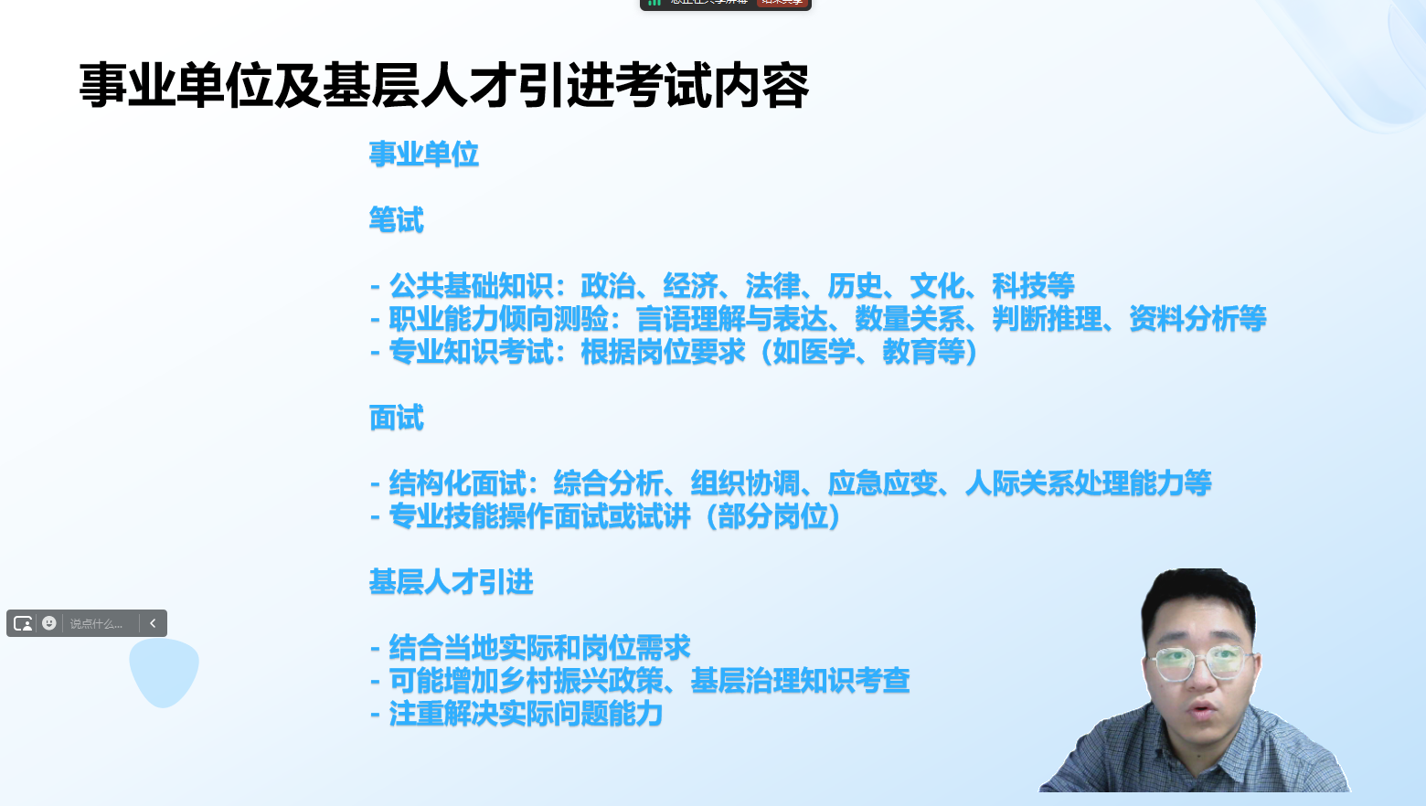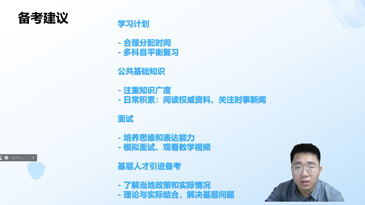 最后,在备考注意事项方面,蒋帅给出了宝贵建议。毕业生们在备考过程中要制定详细的学习计划,合理分配时间用于不同科目的复习。公共基础知识的复习要注重知识的广度和日常积累,可以通过阅读权威资料、关注时事新闻等方式丰富知识储备。职业能力倾向测验则需要多做练习题,掌握解题技巧,提高答题速度和准确率。对于面试备考,要注重培养自己的思维能力和表达能力。可以通过参加模拟面试、观看面试教学视频等方式来熟悉面试流程和提升应对能力。同时,在备考基层人才引进考试时,要针对性地了解当地政策和实际情况,将理论知识与实际应用相结合,提高解决基层问题的能力。