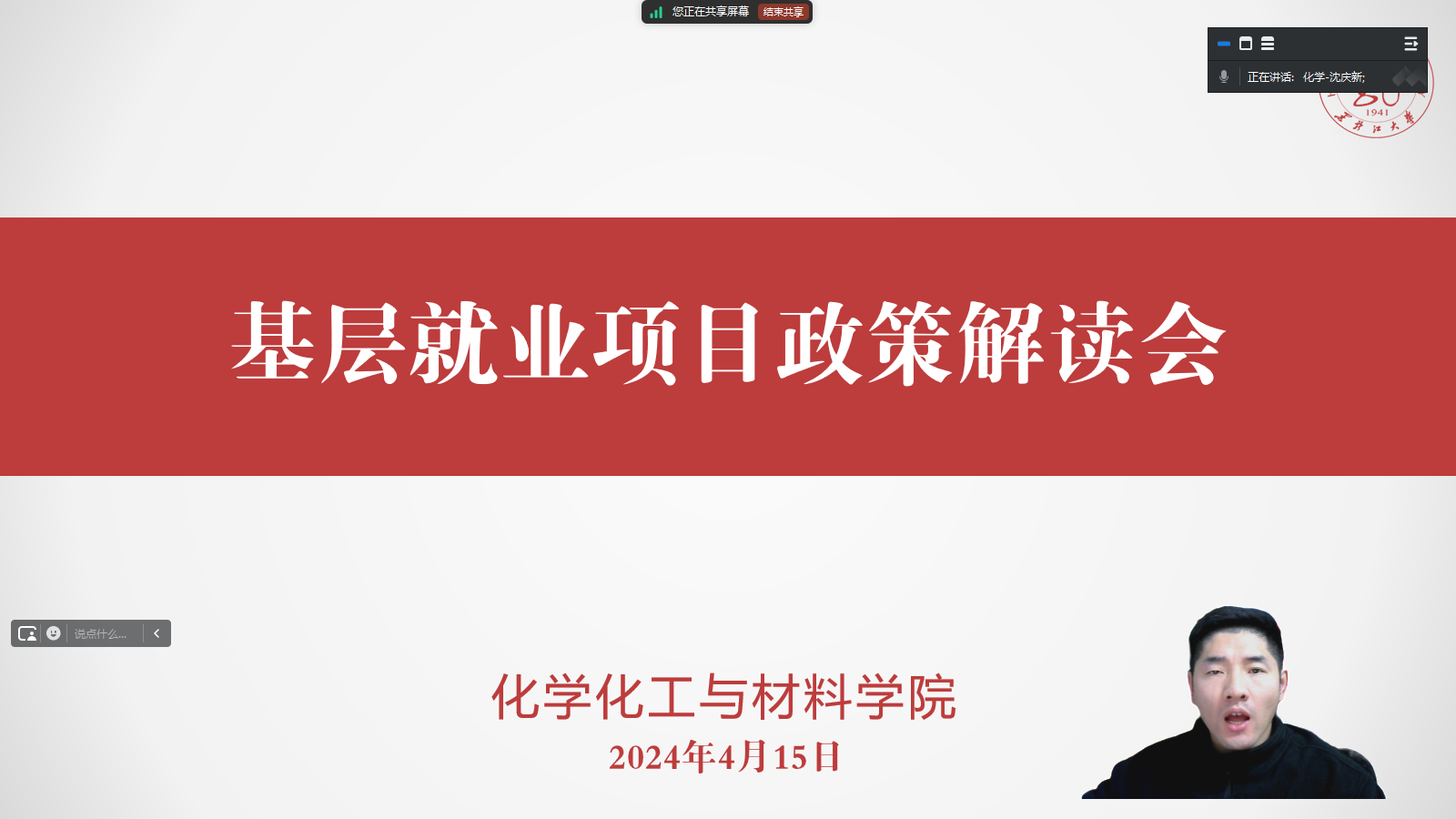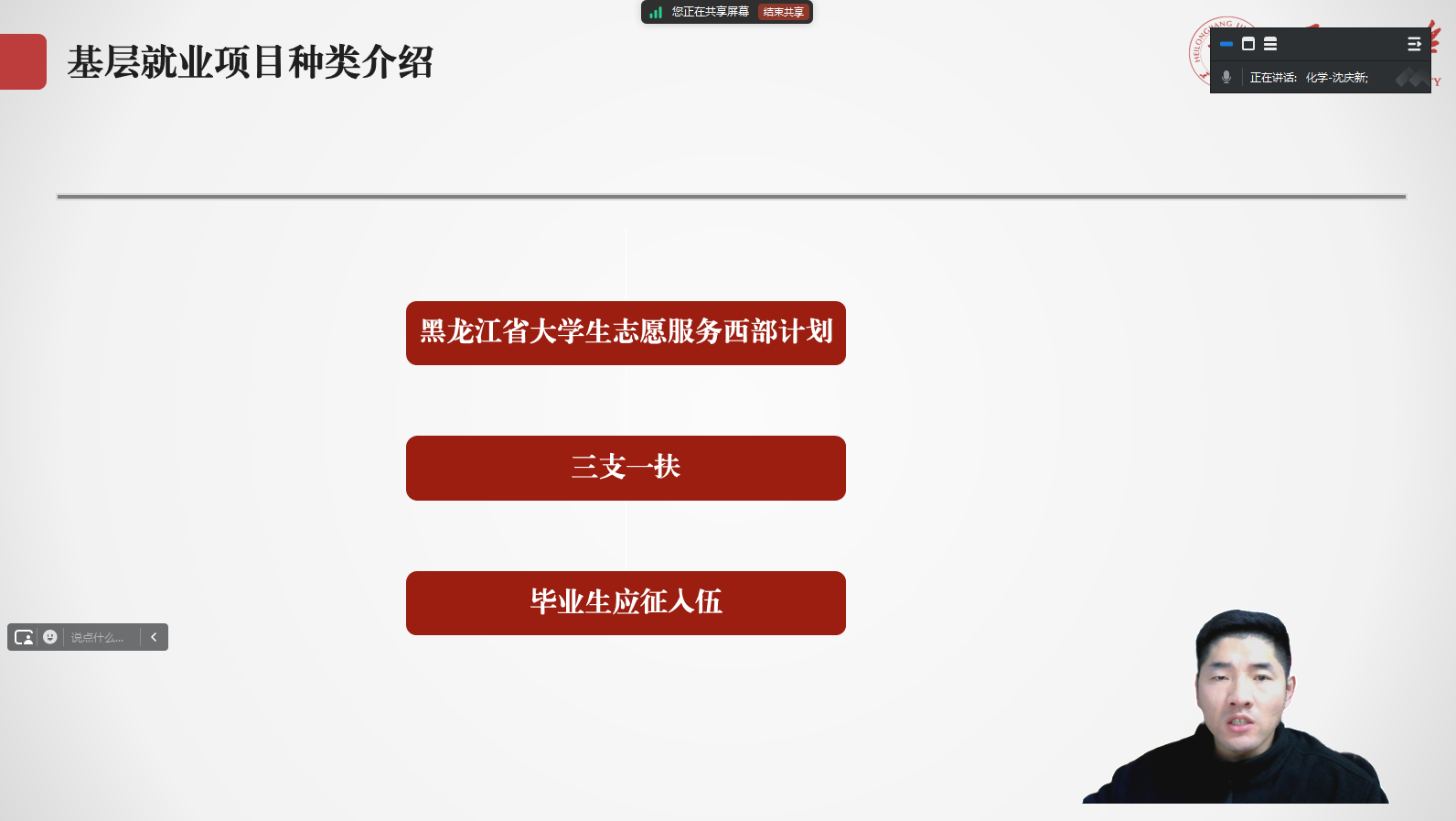为进一步做好老员工志愿服务西部计划、三支一扶、应征入伍工作,弘扬志愿精神,转变老员工的择业就业观念,引导和动员毕业生到西部去、到基层去、到祖国和人民最需要的地方建功立业,xc体育于2024年4月15日线上召开黑龙江省老员工志愿服务西部计划、三支一扶、应征入伍项目解读会,此次会议由2020级辅导员沈庆新主讲,公司部分毕业生参加。