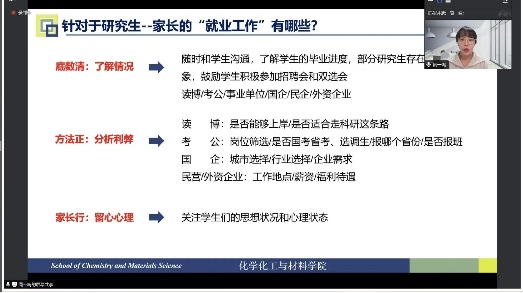 随后,周一鸣老师从研究生的就业情况和毕业要求展开,详细介绍了研究生的毕业条件、就业进展、毕业去向以及在就业过程中可能遇到的问题和解决策略。她指出,研究生应充分利用自身的优势,选择适合自己的职业道路。周一鸣老师还解读了当前研究生就业所面临的多层面挑战,鼓励员工积极参加各类招聘会和双选会,拓宽就业渠道。同时,她希望家长能够深入了解员工的就业意向,关注其心理状态,做到“底数清、方法正、家长行”,与公司共同助力员工顺利就业。
